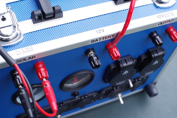 Sinus Inverter für die zwei 230 V Steckdosen, einen 360 W Solarladeregler mit Unterspannungsschutz für die Batterie, einen 12 V Ausgang für