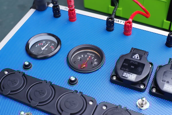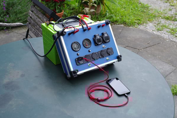 z.B. Beleuchtung oder Pumpen, 6 USB Ports und 2 KFZ-Buchsen für 12 V Geräte.