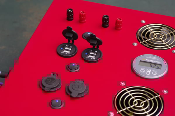 z.B. Beleuchtung oder Pumpen, 4 USB Ports und 2 KFZ-Buchsen für 12 V Geräte.